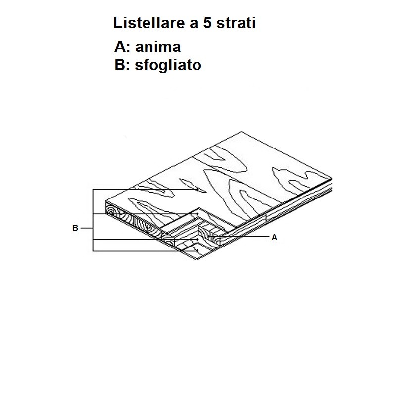 - LISTELLARE 5 STRATI: pannello con anima interna in listelli di pioppo, rivestita su ambo i lati da due strati di sfogliato di pioppo incollati tra loro a venatura incrociata.