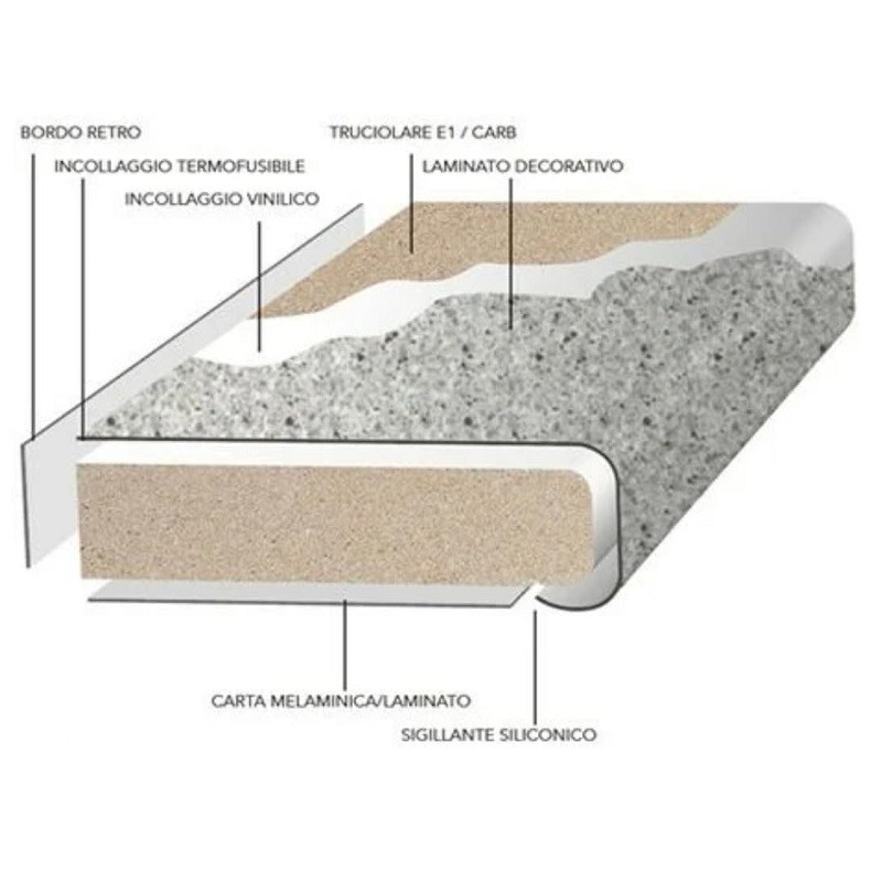 Composto da un pannello in particelle di legno (truciolare idrofugo CLASSE E1) con sopra del laminato stratificato HPL, questi laminati sono pannelli costituiti da strati impregnati di resine melaminiche e fenoliche pressate ad alta temperatura che permettono di ottenere un materiale non poroso con differenti finiture superficiali, dalle più tradizionali a quelle più di tendenza. Offrono una vastissima offerta di colori a disposizione che riproducono, sia alla vista che al tatto, materiali come pietre e legno.